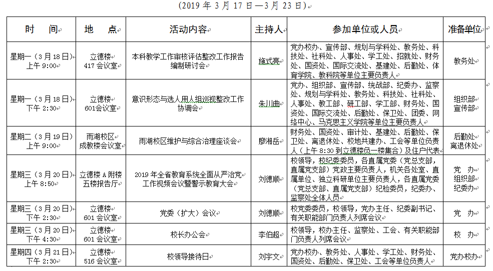 2018-2019学年第二学期第四周会议安排表