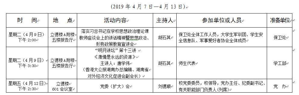 2018-2019学年第二学期第七周会议安排表