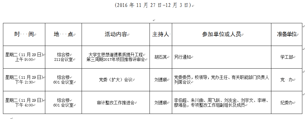 2016-2017学年第一学期第14周会议安排表