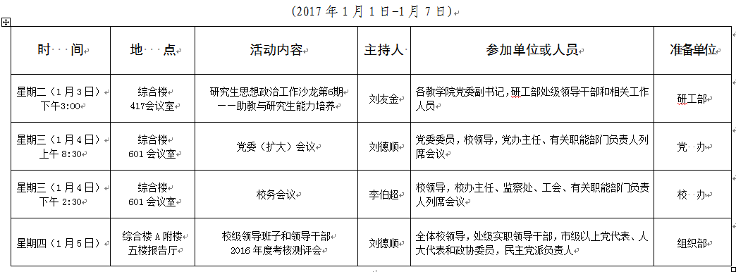 2016-2017学年第一学期第19周会议安排表