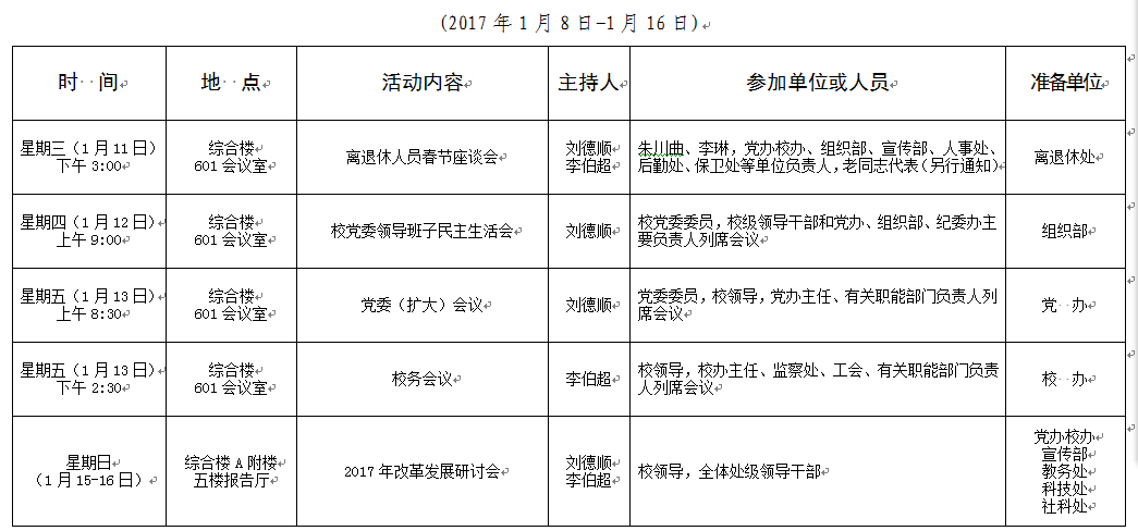 2016-2017学年第一学期第20周会议安排表