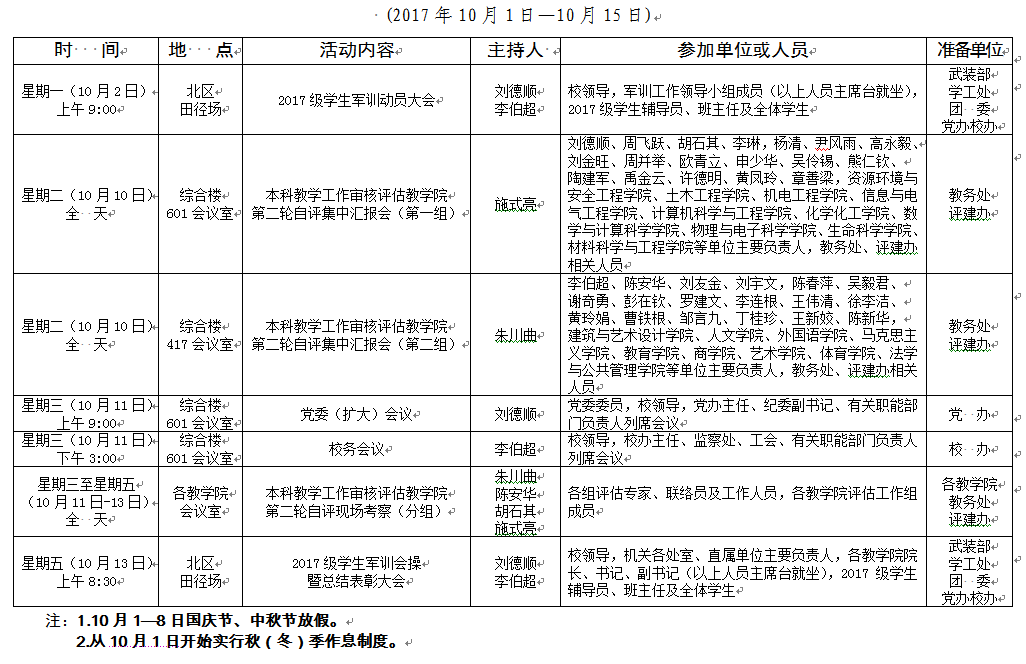 2017-2018学年第一学期第五、六周会议安排表